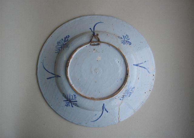 NEVERS - PLAT rond en faïence de grand feu. Décor peint en camaieu de bleu rehaussé de manganèse, représentant le repos pendant la fuite en Egypte. Large guirlande de fleurs sur l'aile.