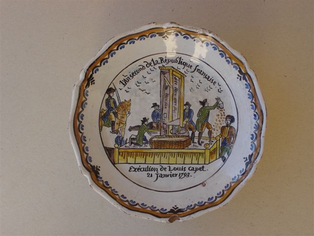 NEVERS - ASSIETTE en faïence de grand feu polychrome "Exécution de Louis Capet 21 janvier 1793 " " L'An second de la République française". Aile chantournée.