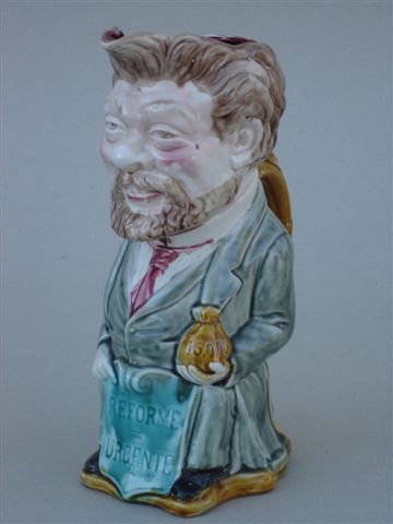 ONNAING - PICHET anthropomorphe dit "Jacquot" en faïence barbotine à l'effigie de Camille Pelletan (1846-1915) tenant de sa main droite l'écusson "Réforme urgente" et de la main gauche une bourse. Marqué en creux 741.