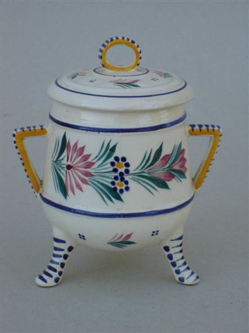 QUIMPER - SUCRIER tripode en faïence à décor polychrome tournant d'une bretonne et de fleurs stylisées. Anses latérales et prise du couvercle en anneau. Marqué HB Quimper.