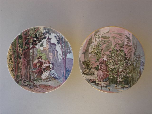 SARREGUEMINES - Deux ASSIETTES décoratives en faïence. Décor imprimé de scènes "Troubadour". L'une représentant une scène galante en forêt, un château à l'arrière plan; l'autre une femme s'approchant d'un cours d'eau en forêt. Marquées.