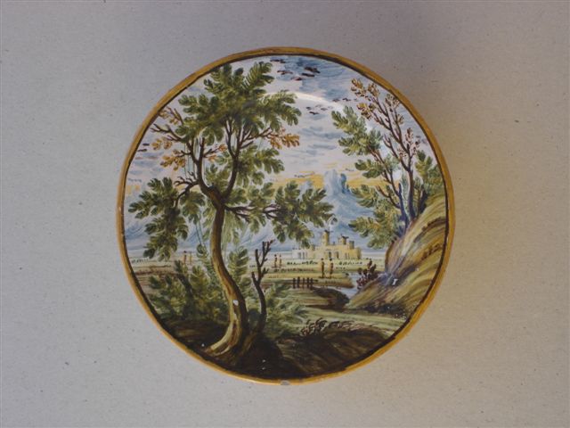 ITALIE (?) - Petite COUPE en faïence de grand feu à décor polychrome d'un paysage.