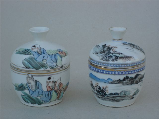 Deux BOLS couverts en porcelaine polychrome. L'un à décor de personnages. L'autre à décor d'un paysage. Filets dorés. Marques au cachet rouge.