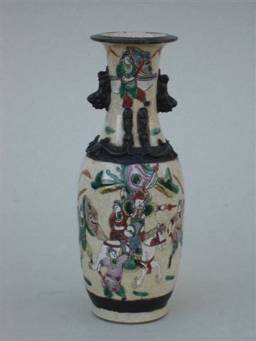 VASE balustre en faïence à décor tournant polychrome de guerriers s'affrontant, sur fond blanc craquelé. Col, Chiens de Fô latéraux, épaulement et base à glaçure brune.