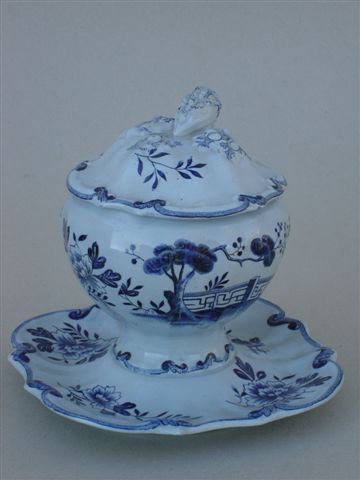Petite SOUPIÈRE couverte en faïence bleutée "Terre de fer" du service "Hollandais". Impression en bleu de fleurs et arbres stylisés dans le goût du Japon. Couvercle et dormant chantournés à décor de volutes en bordure. Prise en graine feuillagée.