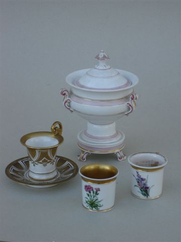 Les deux autres de forme litron en porcelaine blanche et dorée à décor polychrome de fleurs peintes (fêle et mque à l'une).