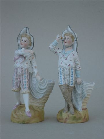 "Les pêcheurs". Deux SUJETS en porcelaine biscuit polychrome représentant des enfants pêcheurs près de leur panier, l'un à la longue vue, l'autre à sa corde.