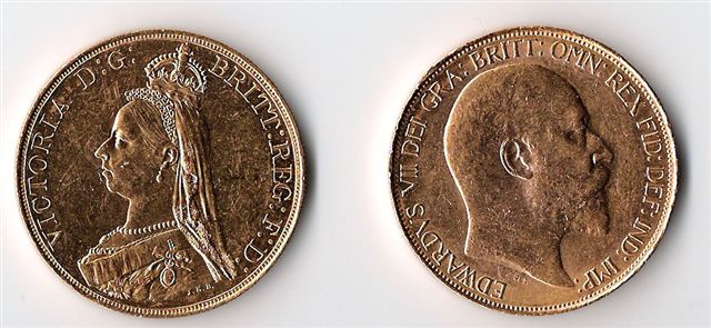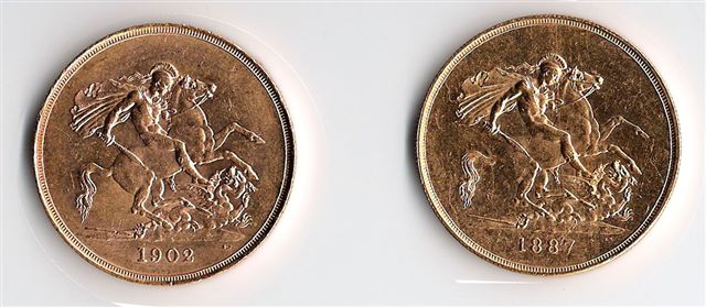 Lot : Grande Bretagne, VICTORIA, 1 pièce de 5 livres ; EDOUARD VII, 4 pièces de 5 livres, les 5 pièces. TTB