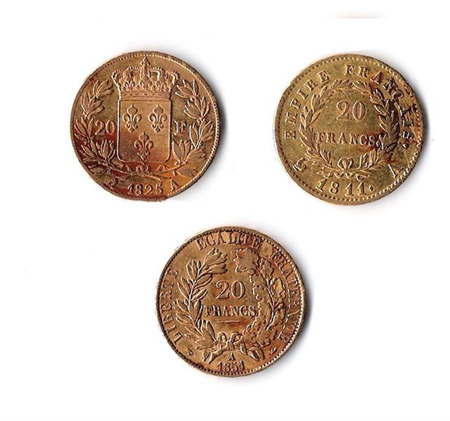 Lot : 3 pièces, NAPOLÉON 1er , 20F, 1811, A ; CHARLES X, 20F, 1825, A ; 2ème RÉPUBLIQUE, 20F, 1851, A. TB/TTB