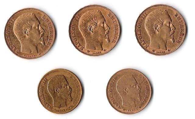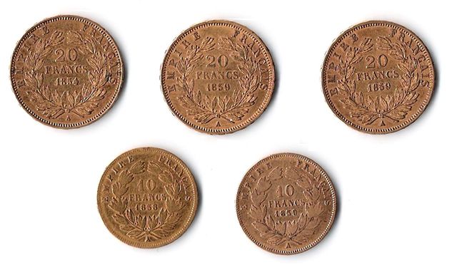 Lot, NAPOLÉON III, 3 pièces de 20F, tête nue, 1854, A, ; 1859, A, (x2) ; 2 pièces de 10F, 1858, A, et 1859 A. Les 5 pièces TB/TTB