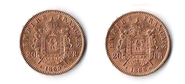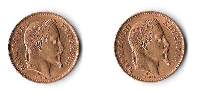 Lot : NAPOLÉON III, 2 pièces de 20F, tête laurée, 1868 et 1869 A. TTB