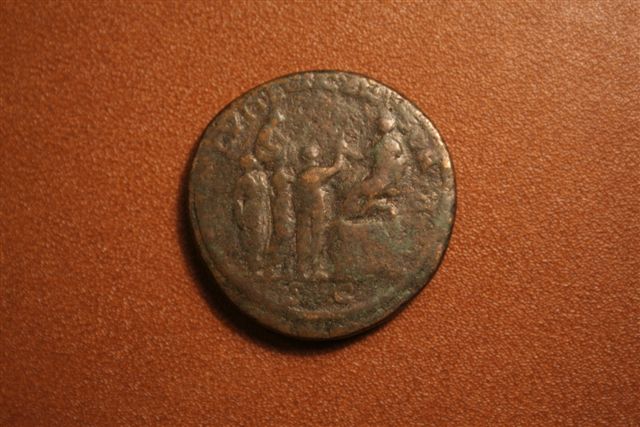 Vitellius assis sur une estrade à dr., à g. un homme en toge assis sur une estrade, en bas trois personnages debout, dont l'un donne la main au censeur.