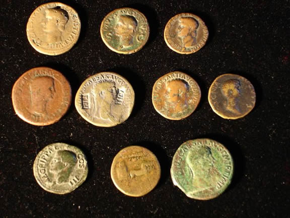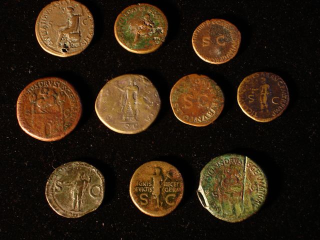 Lot : 10 monnaies romaines, sesterces et as (Auguste, Antonia, Drusus, Tibère, Agrippa, Germanicus, Claude), états divers.