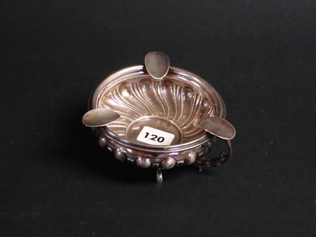 CENDRIER en argent reposant sur trois pieds rapportés représentant des poissons. Corps à décor repoussé de côtes torses. Anse en chimère. Marqué DON GUSTAVO, MADRID SEPT. 1945.