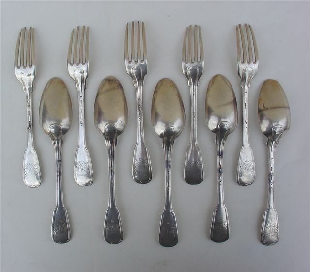 5 COUVERTS de table en argent. Modèle à filet. Initiales dans un écusson. Bordeaux, 1774-1780. Poids : 885 gr.