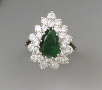 BAGUE or gris et platine, ornée d'une émeraude d'environ 2,82 carats en forme de poire, ceinturée d'un double entourage de diamants : 12 d'un poids total d'environ 1,2 carat et 13 pour 1,56 carat.