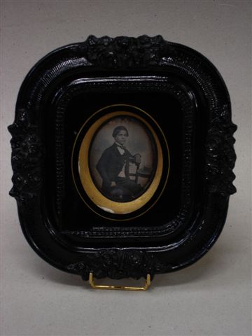 Portrait de jeune garçon. DAGUERRÉOTYPE à vue ovale. Cadre en bois, stuc et composition noircis, à décor de fleurs.