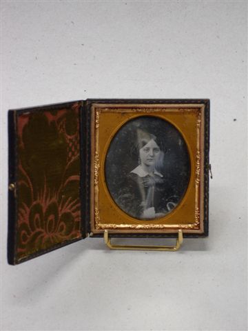 Portrait de jeune fille. DAGUERRÉOTYPE à vue ovale, rehauts d'or. Encadrement en laiton doré amati, jonc repoussé de feuilles d'acanthe en bordure, dans un écrin de cuir noir estampé à décor rayonnant.