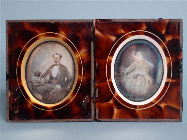 Double portrait assis : mari en redingote et femme en robe de taffetas moiré, colorée. DAGUERRÉOTYPES à vues ovales ; sous verre imitant l'écaille.
