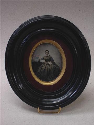 Portrait de jeune femme assise. AMBROTYPE, rehauts polychromes, à vue ovale. Cadre en bois mouluré noirci.