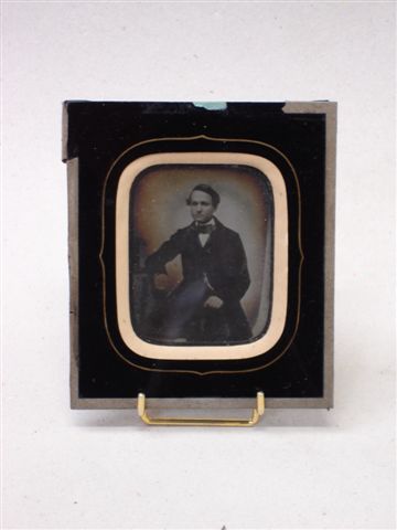 Portrait d'homme en redingotte. AMBROTYPE, réhauts d'argent, sous verre. Étiquette imprimée au dos de la maison Jaquot, rue Saint-Antoine.