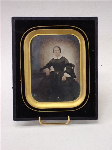 Portrait de jeune femme assise. AMBROTYPE, rehauts d'or, sous verre.