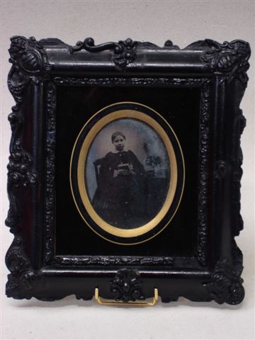 Portrait de communiante. AMBROTYPE à vue ovale. Mention manuscrite au dos "à l'âge de 12 ans et demi". Cadre en bois et stuc noirci à décor de volutes et agraphes de style Louis XV (manques).