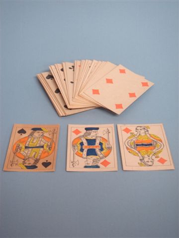 JEUX de CARTES. 35 cartes en papier teinté imprimées, couleurs au pochoir pour les figures. Dos brun à l'éponge.