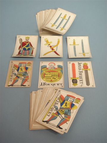 40 cartes imprimées, couleurs au pochoir. Dos à motifs floraux imprimés en pointillé.