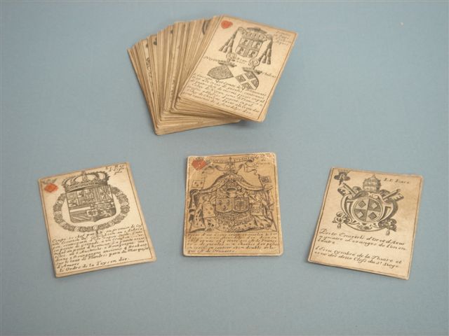 Papier manuscrit indiquant qu'il s'agit de "Cartes d'armoiries de l'Europe à S.A.R de Savoye, par c[laude] O[ronce] F[iné, dit de Brianville], Conseiller et Aûmonier du Roy. Les armes du pape sont celles de la Famille Rospigliosi. Il y a donc lieu d'attribuer le jeu de cartes au règne de Clément IX (Jules Rospigliosi, né à Pistoie le 27 janvier 1600), c'est à dire à la période comprise entre le 20 juin 1667 et le 2 décembre 1662."