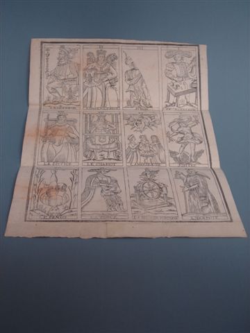 PLANCHE de 12 cartes de Tarot. Gravure sur bois en noir.