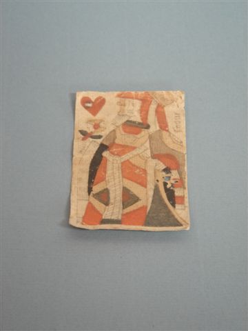 CARTE à JOUER ancienne : Dame de Coeur. Gravure sur bois, couleurs noir et rouge au pochoir. Étiquette manuscrite collée au dos : "Dame de coeur XVè s. détachée du coeuilloir de la Châtellerie de Longvillais Danne, Recques, en 1510".