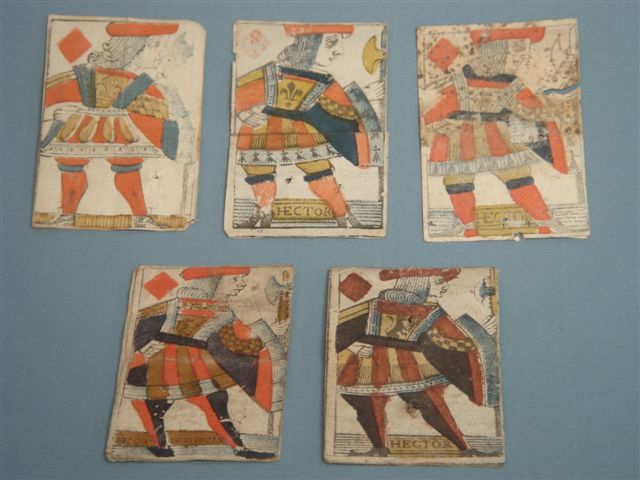 5 CARTES à JOUER anciennes : Valets de carreau. Gravure sur bois, couleurs au pochoir. 8,5 x 5,5 cm environ. (petits trous et rest.)