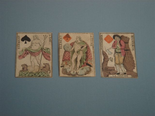 3 CARTES à JOUER anciennes : L'eau, La terre et Bûcheron, gravures, couleurs au pochoir.