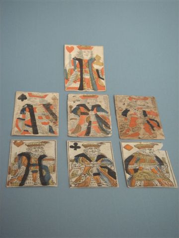 7 CARTES à JOUER anciennes : 3 Rois de trèfle, 2 Rois de coeur, un Roi de pique et un Roi de carreau. Gravures sur bois, couleurs au pochoir.