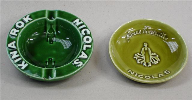 Lot comprenant 1 CENDRIER en faïence à couverte verte orné de 2 représentations stylisées de Nectar, sur le bord l'inscription moulurée "KINA ROK, NICOLAS, et 1 COUPELLE à décor en relief de Nectar entouré des mentions "fines bouteilles" et "NICOLAS".
