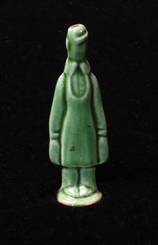 FIGURINE en faïence émaillée verte représentant Nectar portant une bouteille dans chaque main.