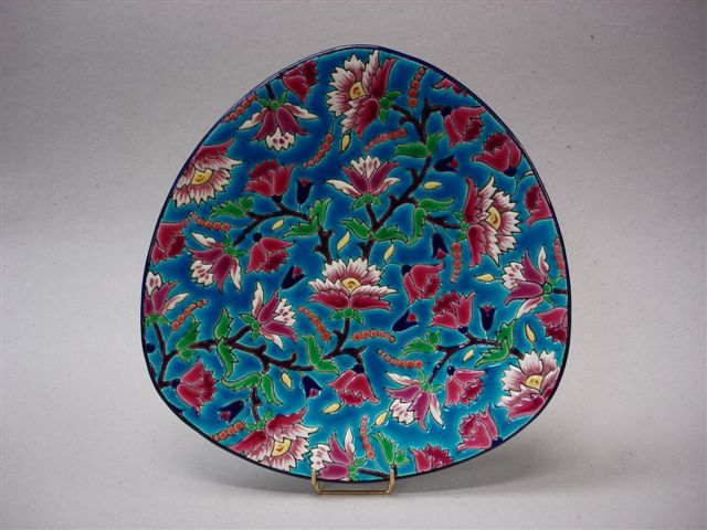 PLAT à 3 côtés, à décor de semi de fleurs sur fond bleu. Marques manuscrites Forme 3522, Décor 5685 dans un rectangle.