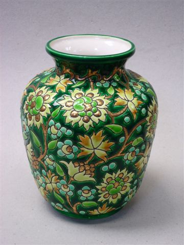 VASE pansu. Décor de branches fleuries sur fond vert et or.