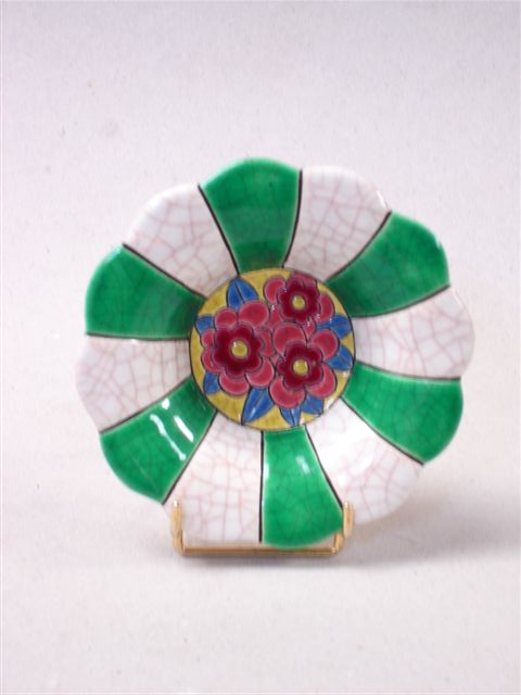 COUPELLE à bord contourné. Décor de fleurs polychromes sur fond jaune en son centre, et de bandes rayonnantes alternativement vertes et blanches sur le bord.