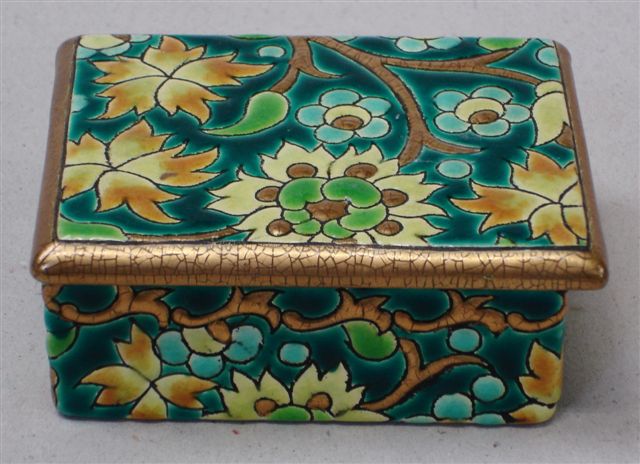 BONBONNIÈRE rectangulaire. Décor de branches dorées fleuries sur fond vert.