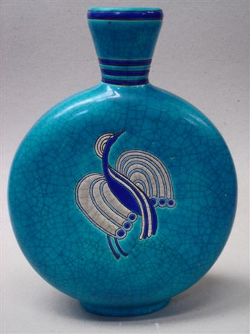 VASE gourde. Décor de Jean LUCE, phoenix stylisé sur fond bleu ciel craquelé. Le col cerclé de bleu foncé.