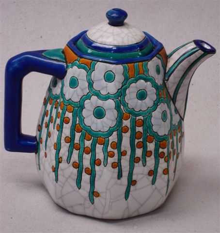 LONGWY - THÉIÈRE à pans. Décor de fleurs stylisées en vert et blanc, les tiges séparées par des pois jaunes, décor sur fond blanc craquelé.