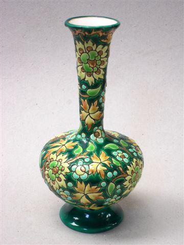 VASE soliflore. Décor de fleurs à branches dorées sur fond vert.