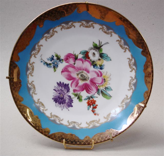 Lot comprenant 1 ASSIETTE de Limoges en porcelaine à décor d'un bouquet de fleurs sur fond blanc, bordure à décor rocaille doré. Marque Limoges France et blason, et 2 COMPOTIERS Terre de fer, modèle du service de Louis XV, décor en grisaille de fleurs. La bordure à feuillages contournés.