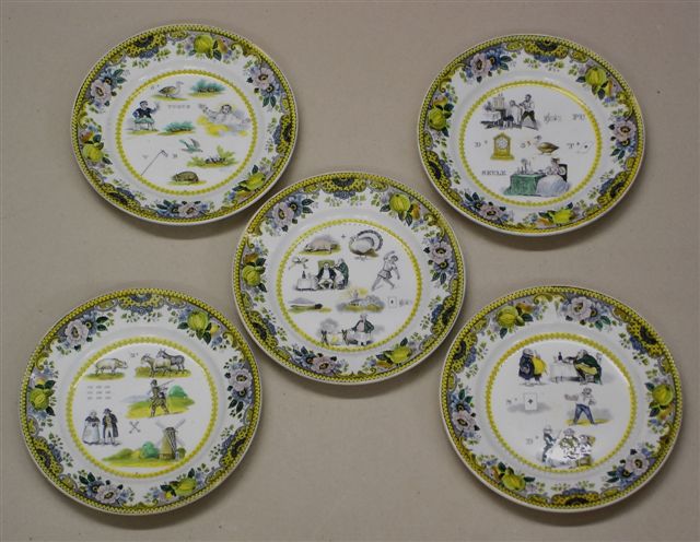 CHOISY - 10 ASSIETTES à décor polychrome sur fond blanc illustrant des rébus, la solution marquée au dos de l'assiette. Bordure de compositions fleuries. Diam. 21cm. Fin XIXème.