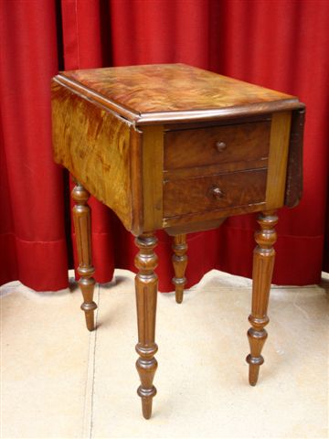 TABLE de nuit à volets en acajou et placage d'acajou ouvrant à deux tiroirs, un vide-poche et un abattant. Pieds tournés et cannelés et plateau galbé.