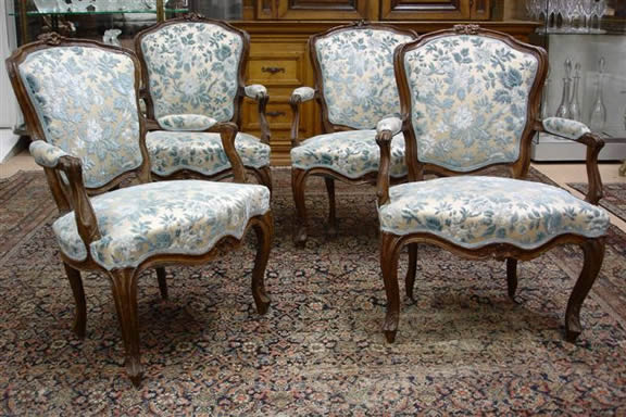 Suite de quatre FAUTEUILS en bois naturel mouluré à décor sculpté de fleurettes sur le haut du dossier et la traverse antérieure. Dossier cabriolet, piètement galbé.