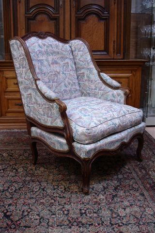BERGÈRE confessionnal en bois naturel mouluré. Dossier et traverse antérieure galbés, sculpté de fleurettes et de feuillage. Pieds cambrés, accotoirs en retrait. Marque manuscrite à l'encre "Ctesse de Douglas" à deux reprises sur les traverses.