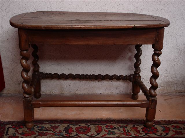 BUREAU ovale en noyer tourné. Il ouvre en ceinture à un tiroir. Repose sur 4 montants torsadés reliés entre eux, et terminés par des pieds boule.